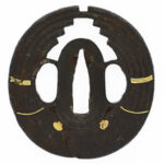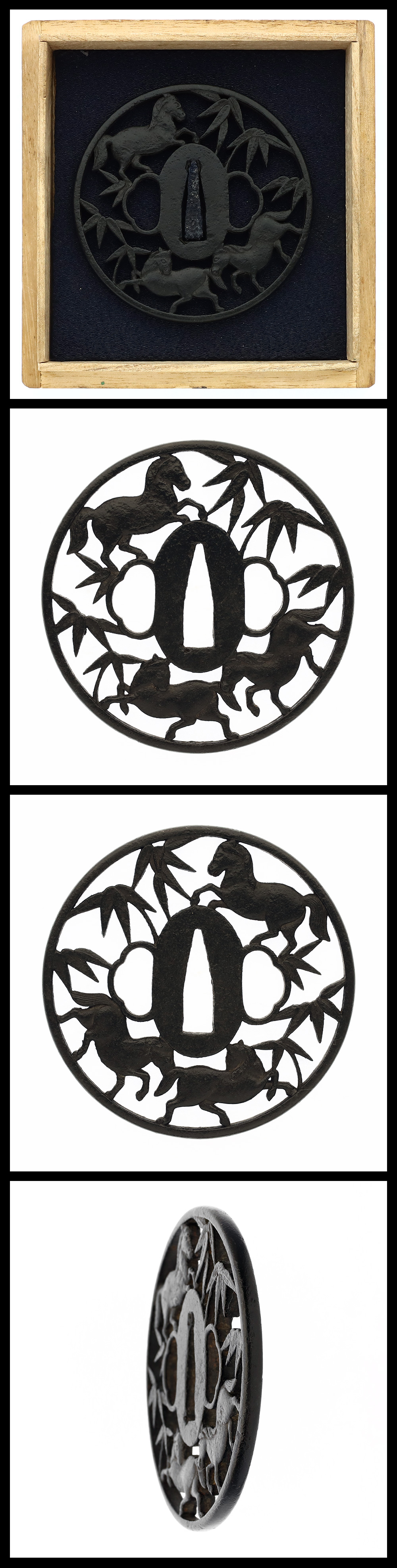 A round iron tsuba featuring an openwork design of bamboo grass and a horse.