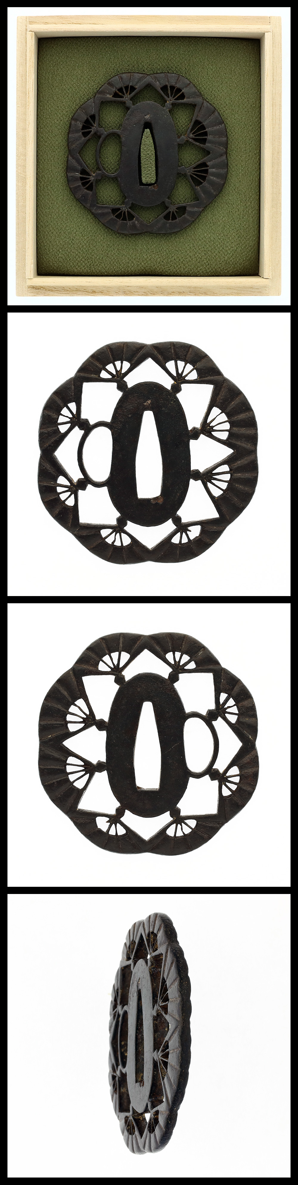 An iron tsuba featuring an openwork (sukashi) design of a folding fan.