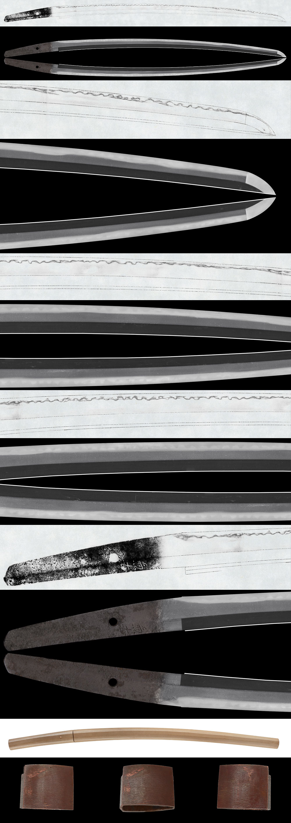 Hamon:Ko-nie-deki with irregular gunome pattern, double hamon (nijūba), and fine kinsuji patterns.