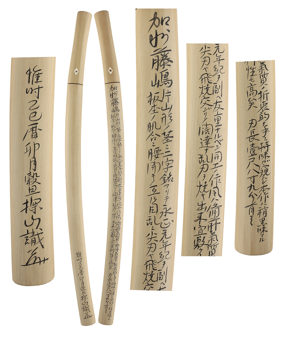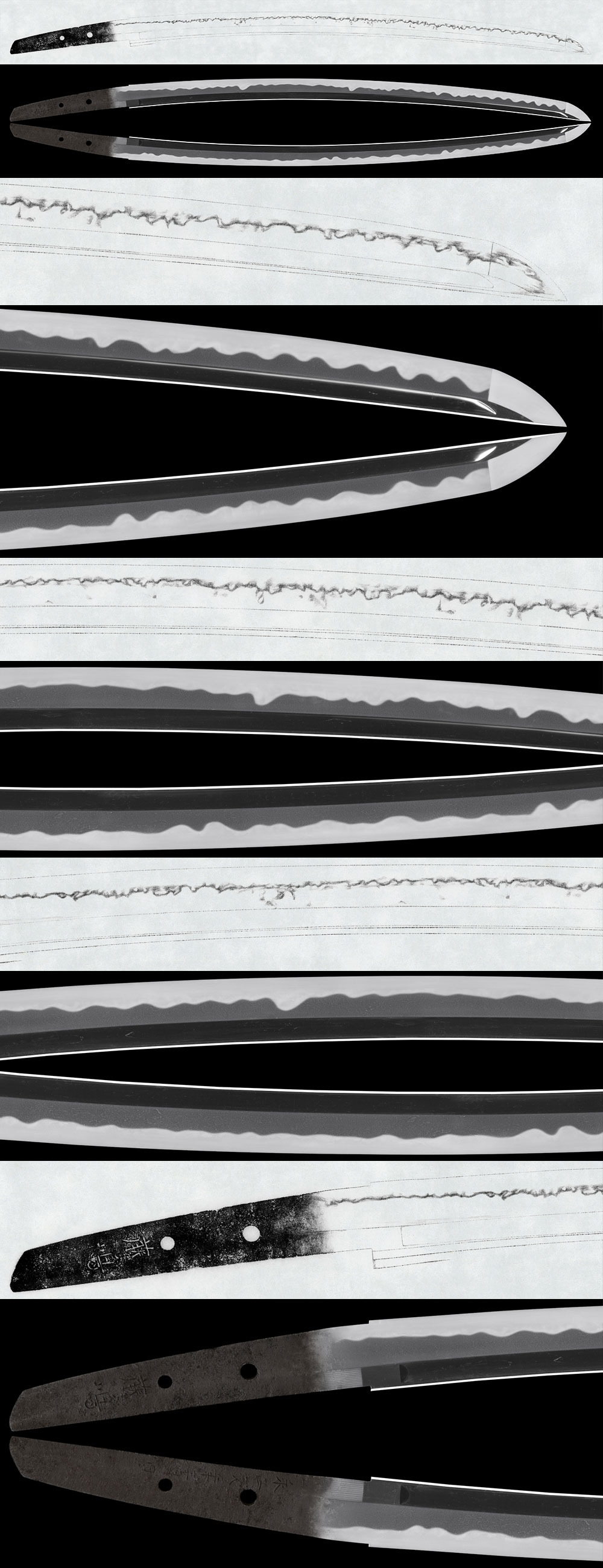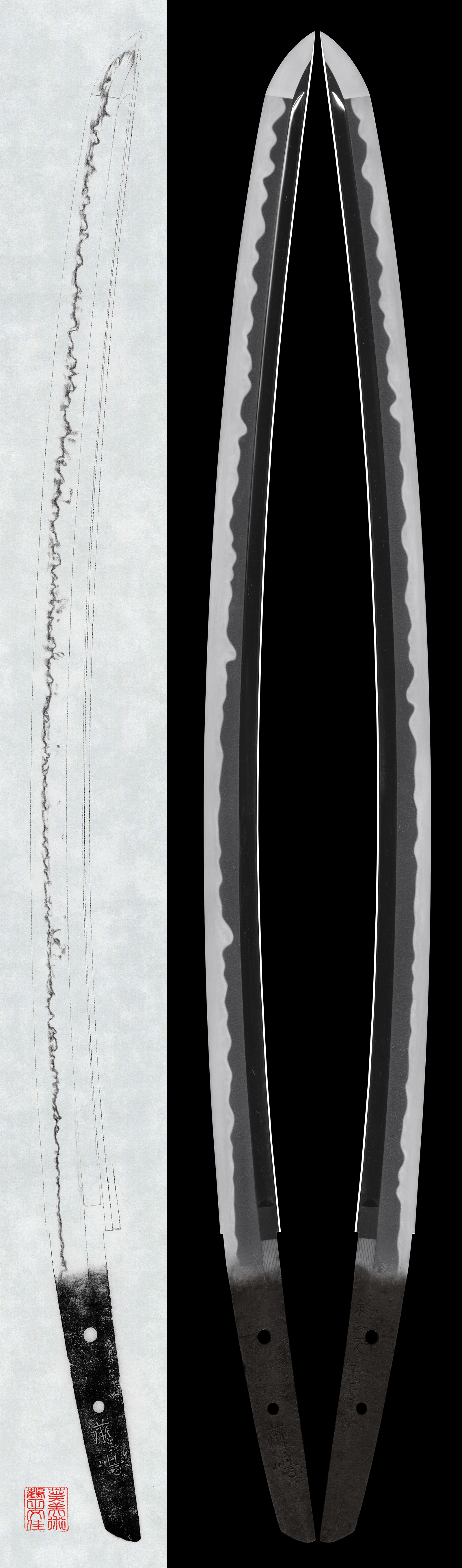 This piece displays a slightly dark itame-hada, with a hamon of wide-based gunome-midare. The temper line includes pointed elements and tobiyaki (scattered temper), forming a lively and dynamic pattern. The workmanship is highly commendable, and the sword also holds strong value as a reference example for the study of the Kashū Fujishima school.