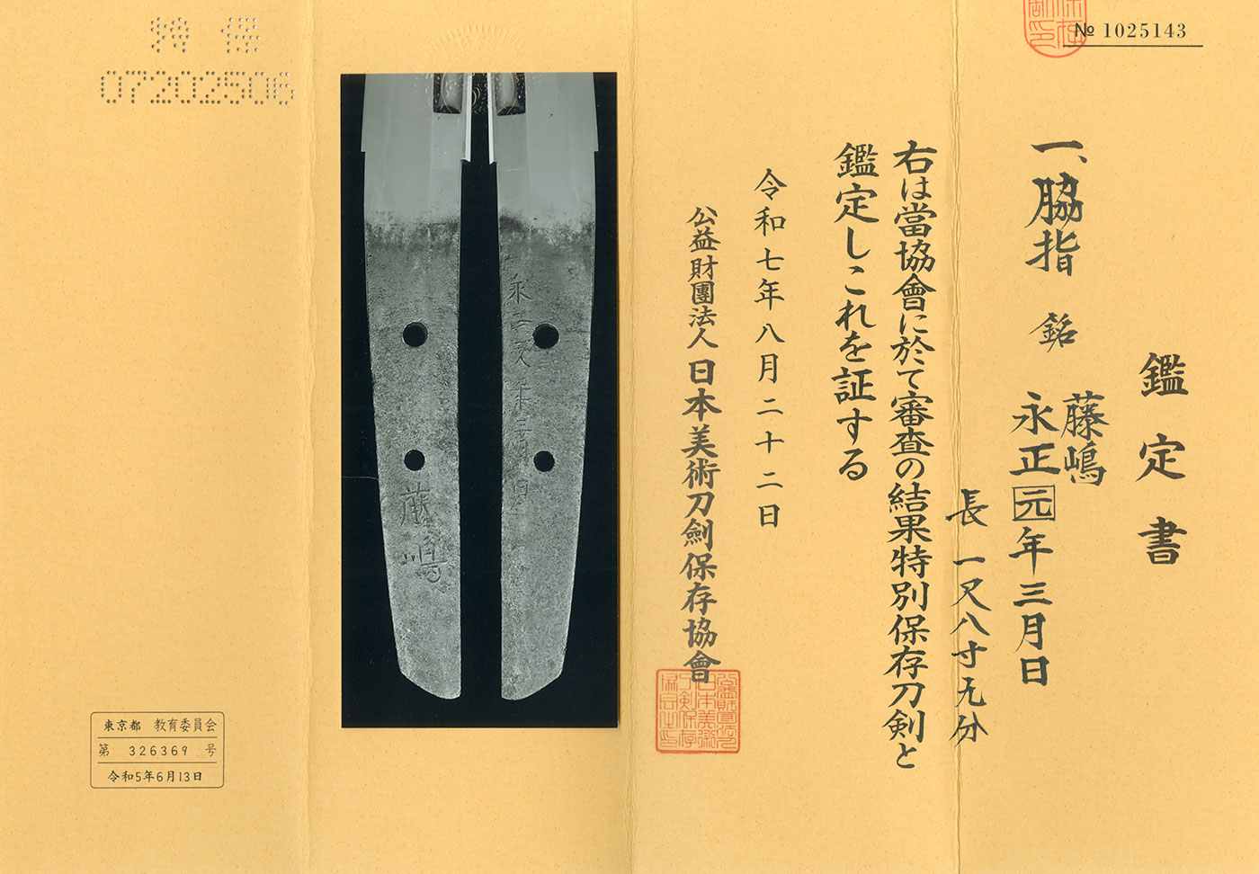 NBTHK Tokubetsu Hozon Certuficate