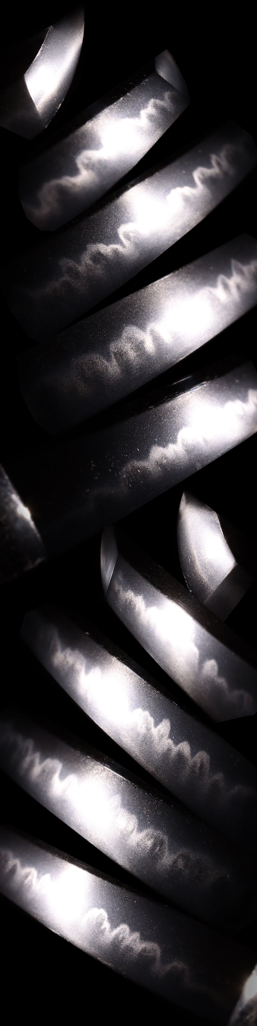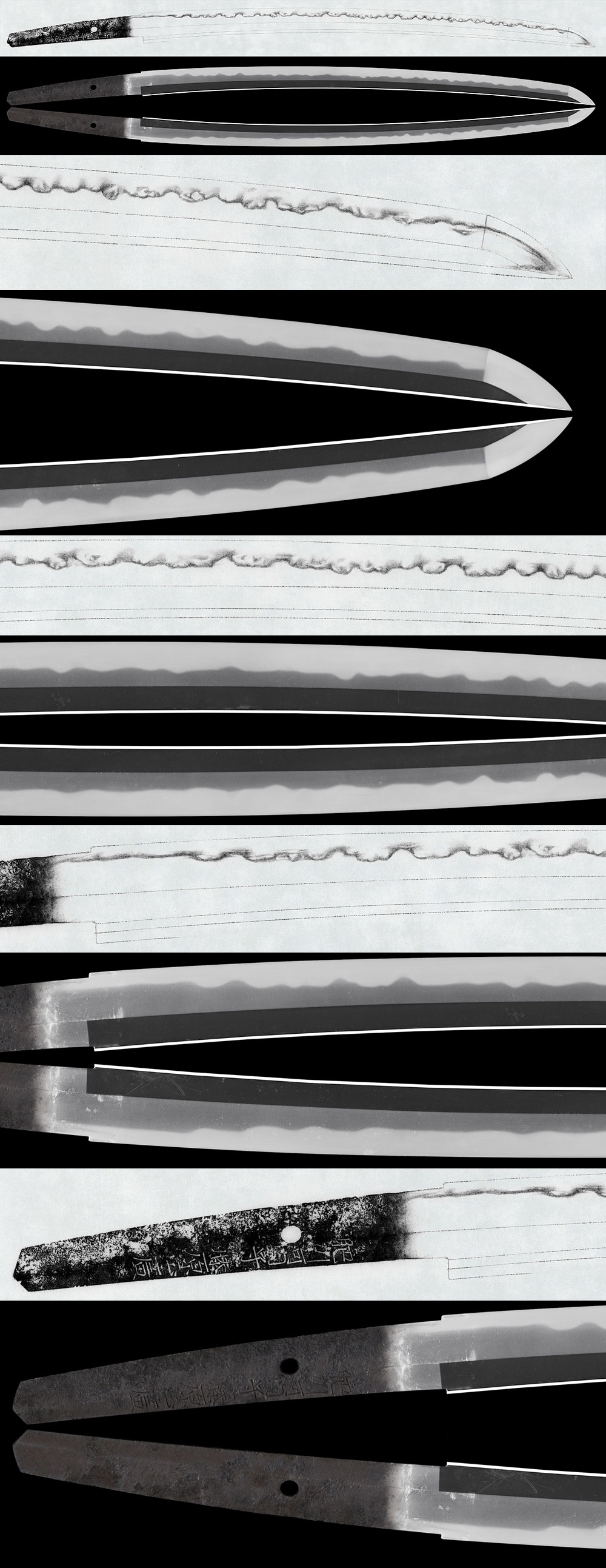 Hamon: Nie-deki with rounded gunome-midare, with an active nioiguchi.