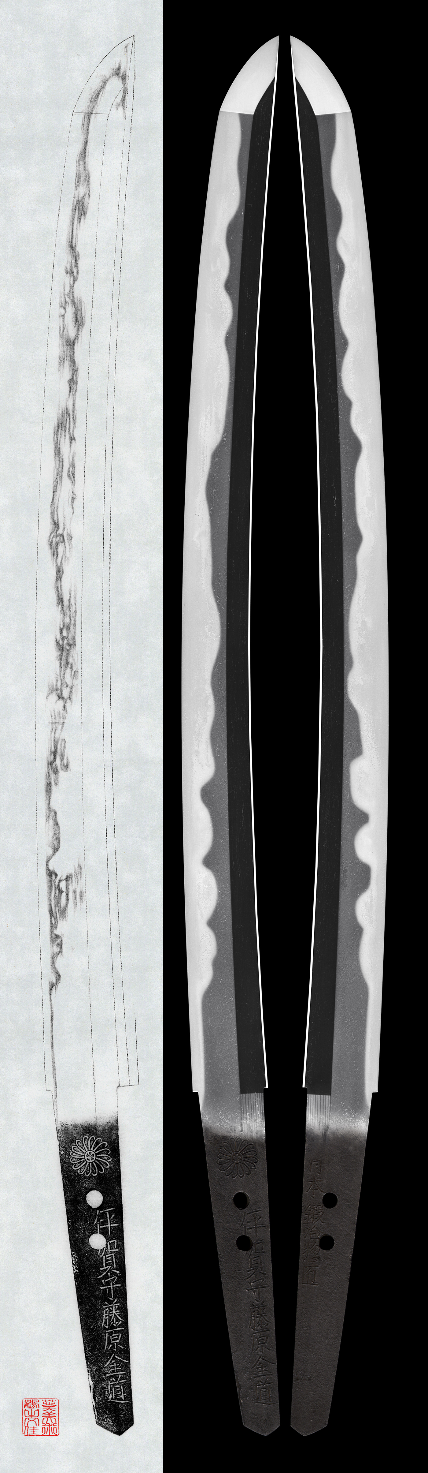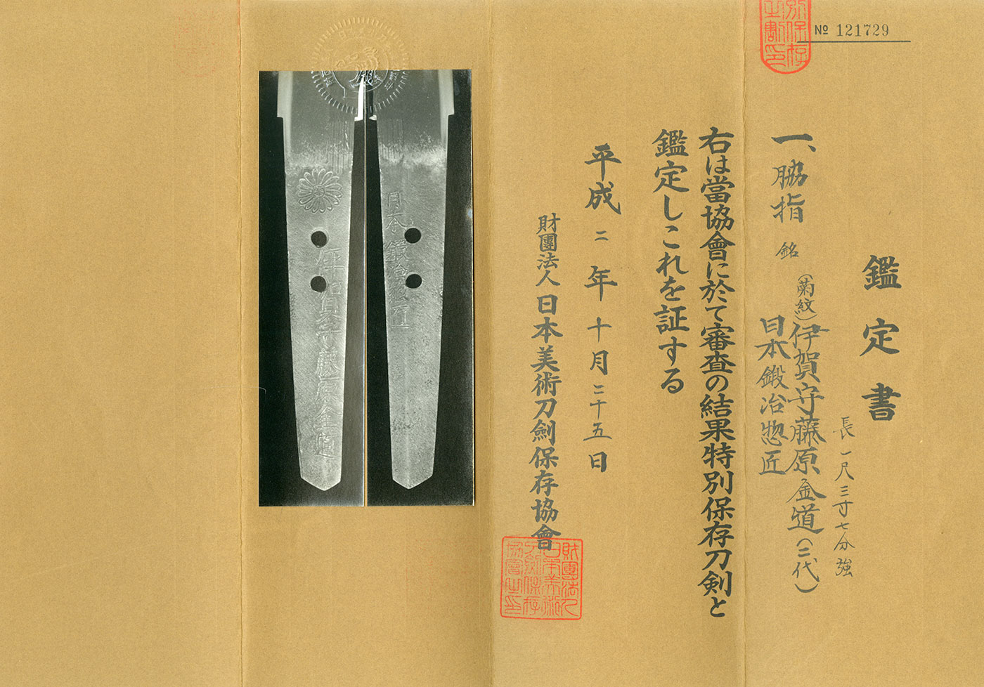 The 1st-generation Iga no Kami Kinmichi moved to Kyoto with his father Seki Kinmichi, his brothers Izumi no Kami Kinmichi, Tanba no Kami Yoshimichi, and Etchu no Kami Masatoshi, where each became active in their craft. From the second generation Kinmichi, he was granted the title of "Nihon Kaji Sosho" (Chief Swordsmith of Japan). From then on, the title "Iga no Kami" and "Nihon Kaji Sosho" were inherited, and carved the chrysanthemum crest on the tang.