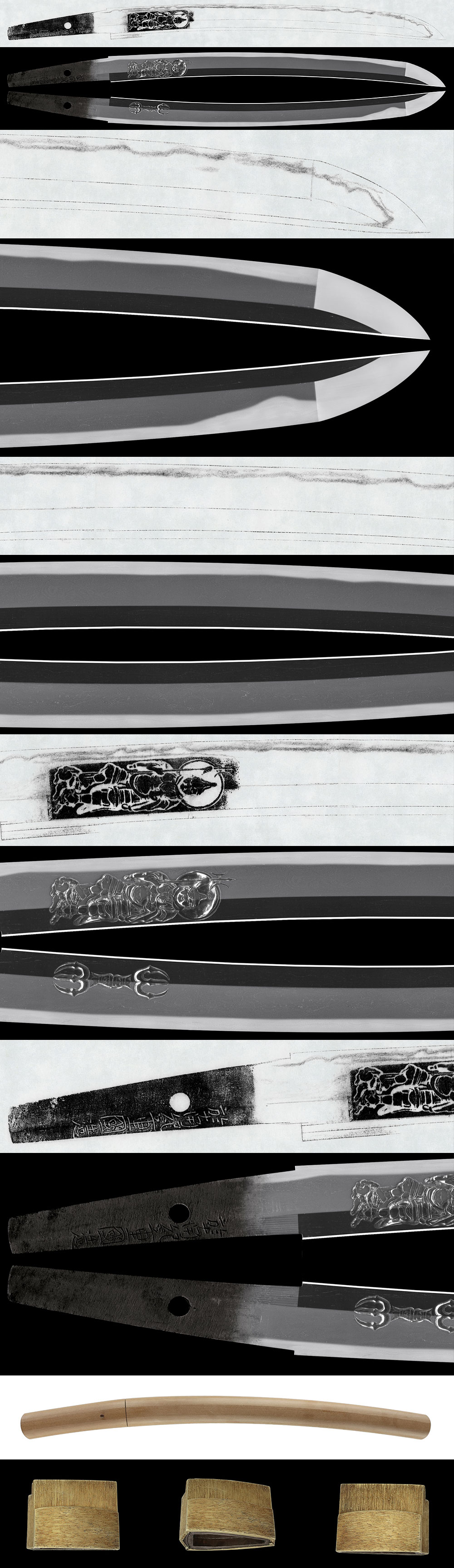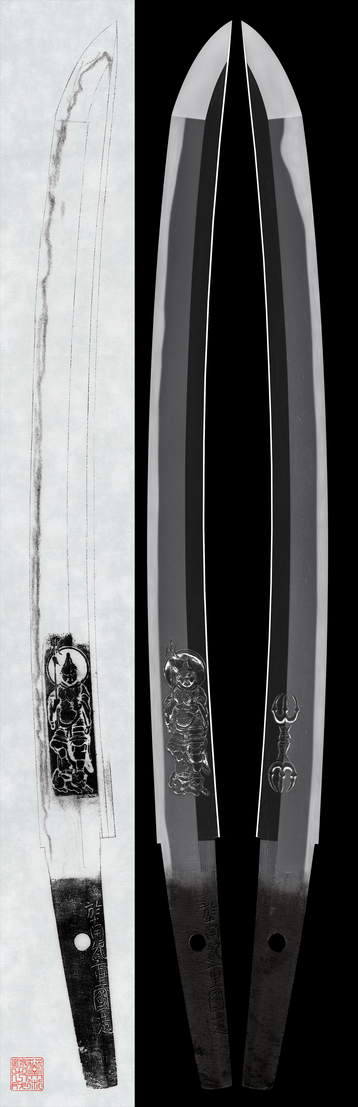 On one side of the blade is a carving of Bishamonten, and on the other side a dokko (vajra).
