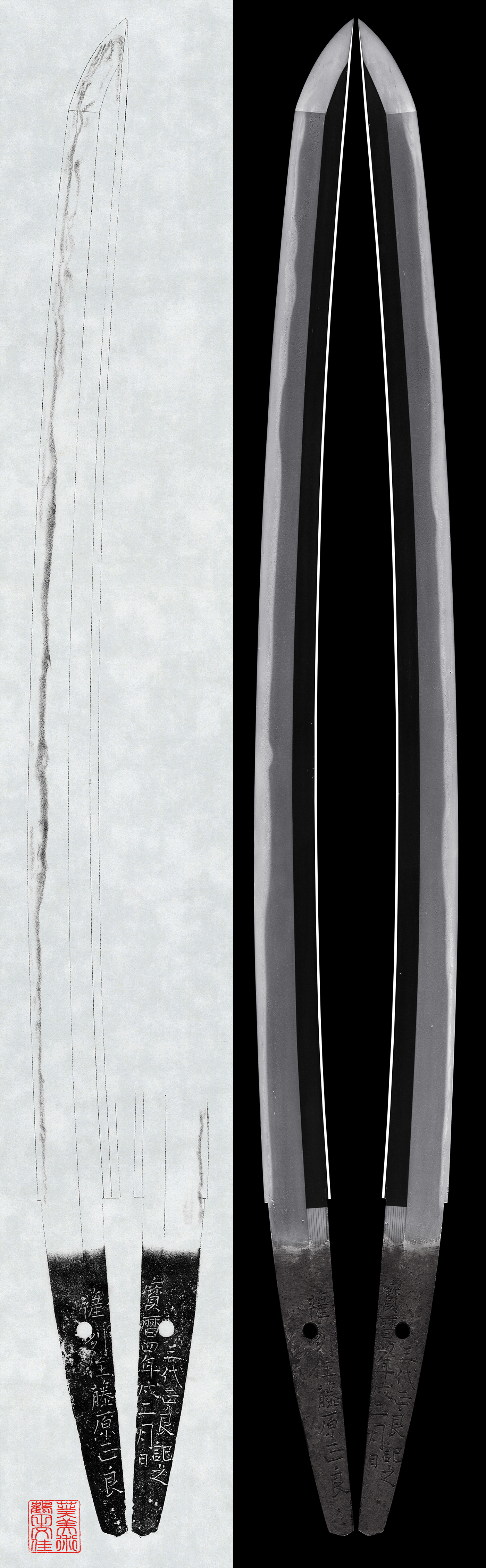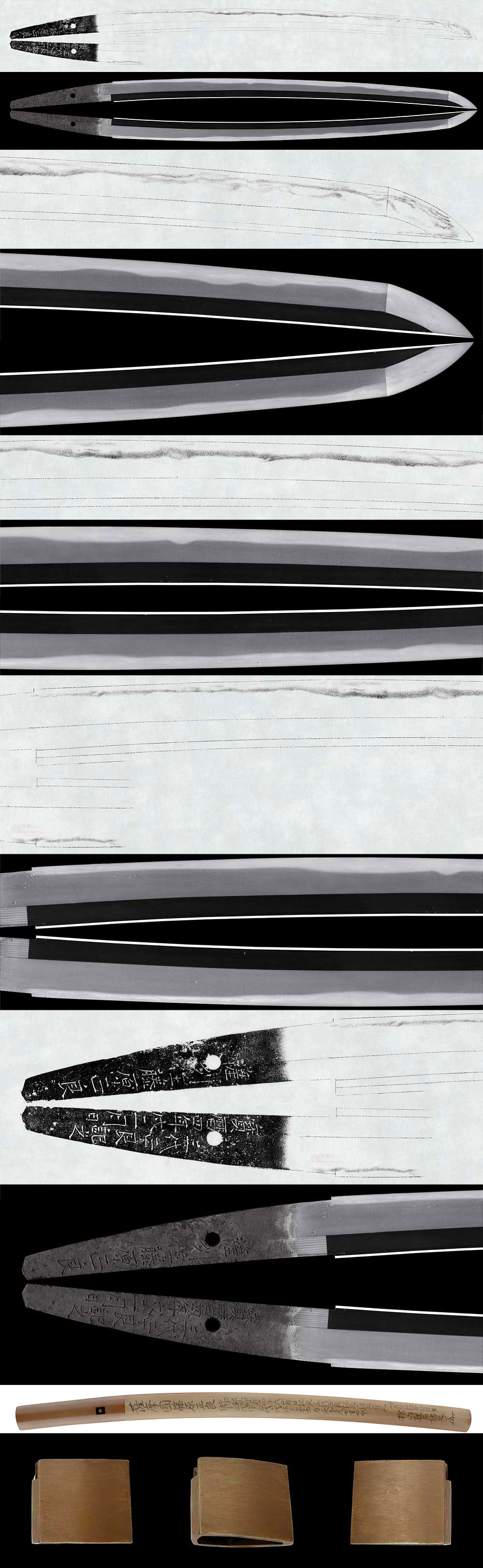 Sasshu Ju Fujiwara Masayoshi 3rd was a son of 2nd Masayoshi. He was a swordsmith of Satsuma province, present Kagoshima prefecture,and followed Miyahara Masachika school. He changed his name to 'Hoki no kami Ason Masayuki' in Kansei 1st (1789). He was well known as 'Masayuki' and worked actively Kansei era.Masayoshi' was his first signature and this work was made when he was only 22 years. It was a fantastic work approved Tokubetsu Hozon. There are one-pin-hole in the middle of the blade, and more or less rusty part in the nakago. Regardless of those faults, we strongly recommend it as his earliest excellent work.