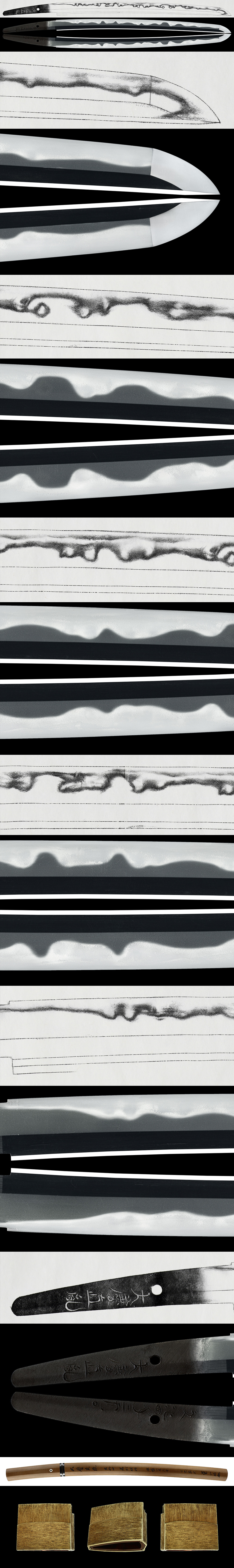 Takei Naotane was a master craftsman representing the Shin-Shin-to period. He was a student of Suishinshi Masahide and served as a domain craftsman of the Akimoto family of the Yamagata domain. He practiced the theory of restoration of the old swordsmanship advocated by his master Masahide, and was especially good at Soshu-den and Bizen-den, and left masterpieces of these styles. Naotane was active for about 50 years from Kyowa to Ansei, and this work was made when Naotane was stilll young, around 30 years old. This piece has dynamic Gunome midare Hamon called Doranba, and is an imitation of Tsuda Echizen Sukuhiro. It is rare that Naotane, who made many pieces in the old sword style, made this piece in the Shinto style. His dexterity in creating works in a variety of styles is evident.
