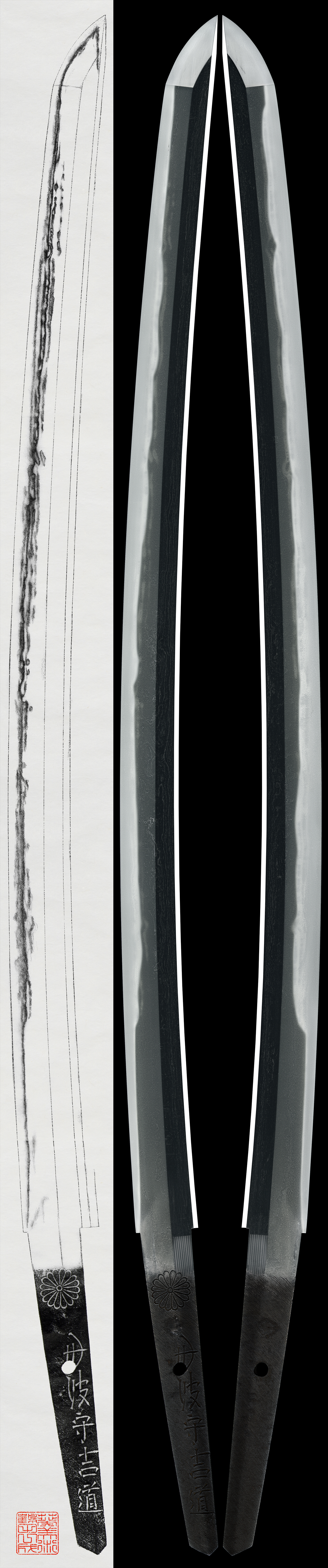 The first-generation Tanba no Kami Yoshimichi was the third son of Kanemichi, the founder of the Mishina school, and moved to Kyoto together with his father and brothers. From the second generation onward, the lineage split between Osaka and Kyoto, with the Kyoto Tanba branch characteristically engraving a chrysanthemum crest on the tang.