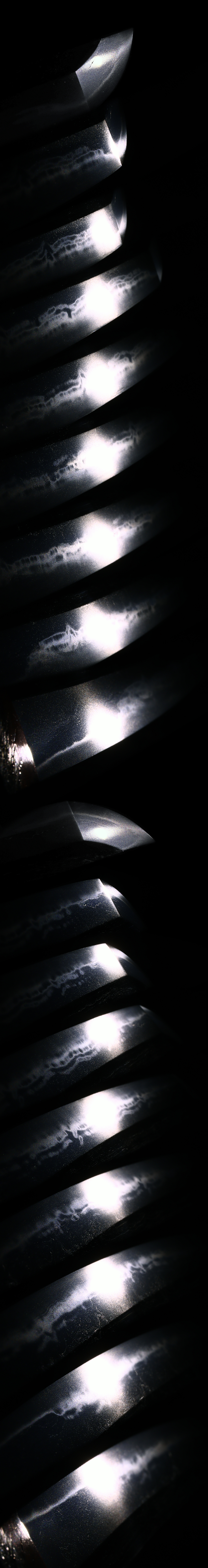 For generations, they are known for forging a distinctive striped hamon called “Sudare-ba,” in which sunagashi and tobiyaki appear running parallel to the edge.