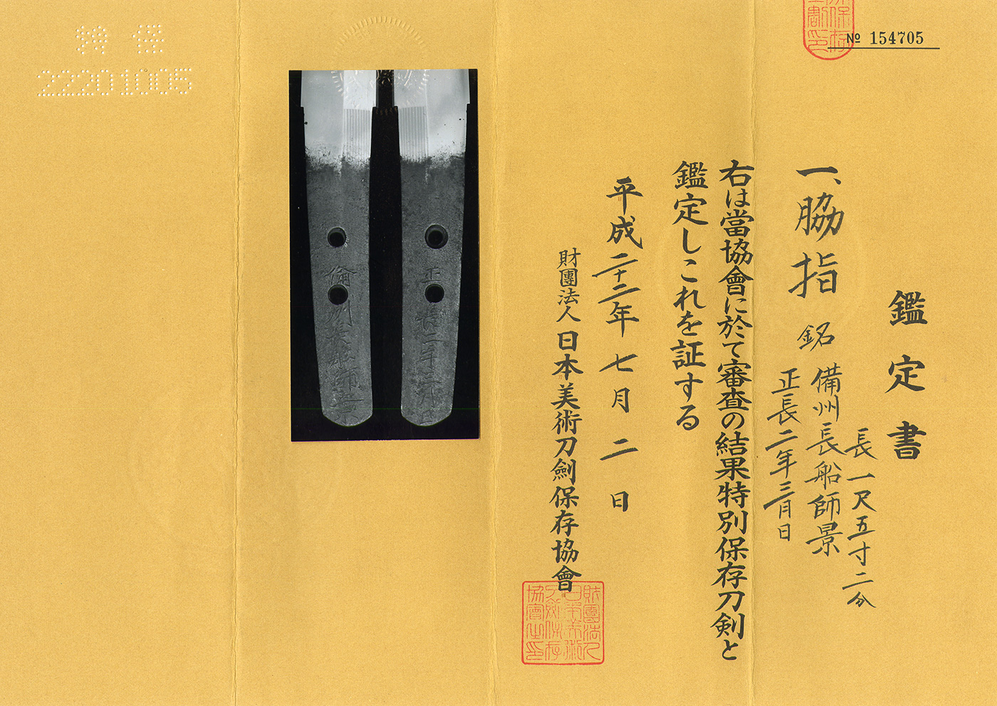 Wakizashi: Hishu Kawachi no Kami Fujiwara Masahiro. (NBTHK Tokubetsu Hozon Token)