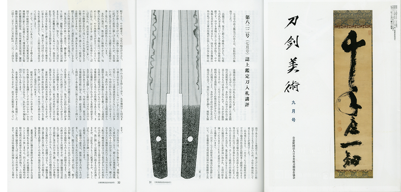 Features: Bishu Osafune Norimitsu of the first generation was a student of Nagamitsu, and this work corresponds to around the 4th generation. The Norimitsu lineage continued from the Nanbokucho period through to the late Muromachi period. This piece is an उत्कृष्ट work by Bishu Osafune Norimitsu (4th generation), and the koshirae is also superb. It is published in Token Bijutsu, September Reiwa 7 (2025), No. 824, p.31.