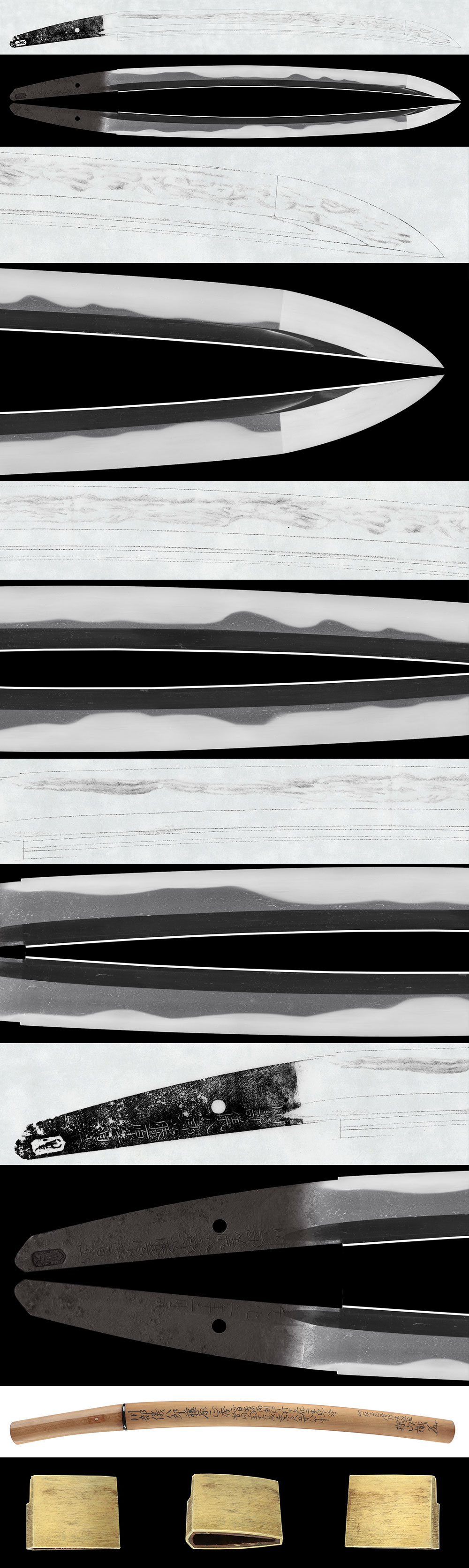 It shows a bold shape with wide width and large kissaki, flowing itame hada standing out, with a large midare-style notare hamon, deep nioiguchi with strong nie activity, including yubashiri, sunagashi, kinsuji, and striped temper patterns, and a boshi forming a flame-like shape, full of vigor, representing an उत्कृष्ट Soshu tradition work among his oeuvre.
