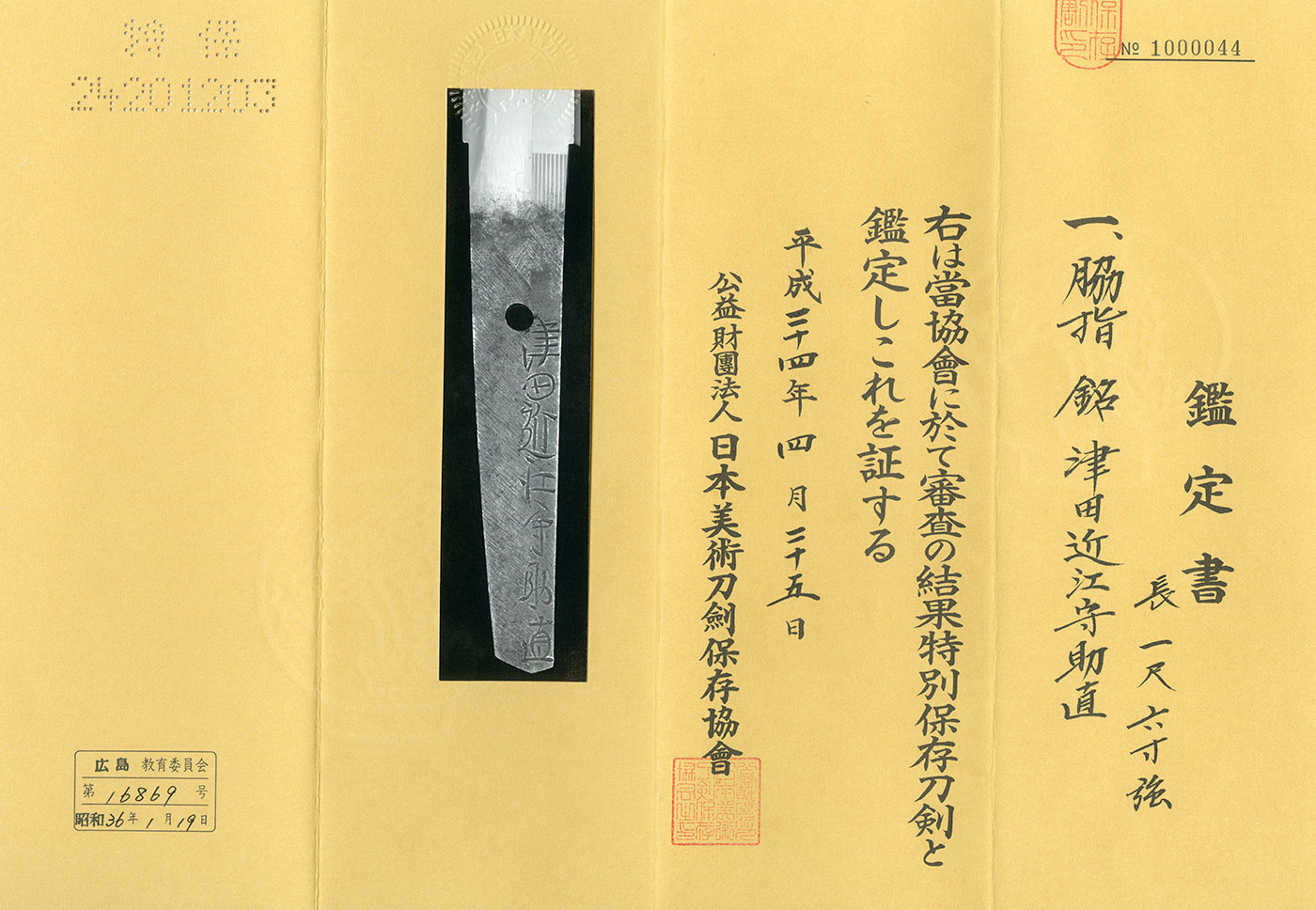 Wakizashi: Omi Daijo Fujiwara Tadahiro(NBTHK Tokubetsu Hozon Token)